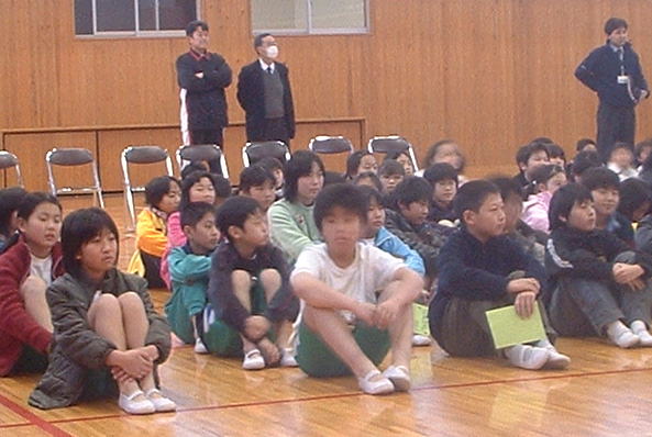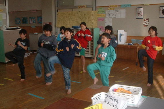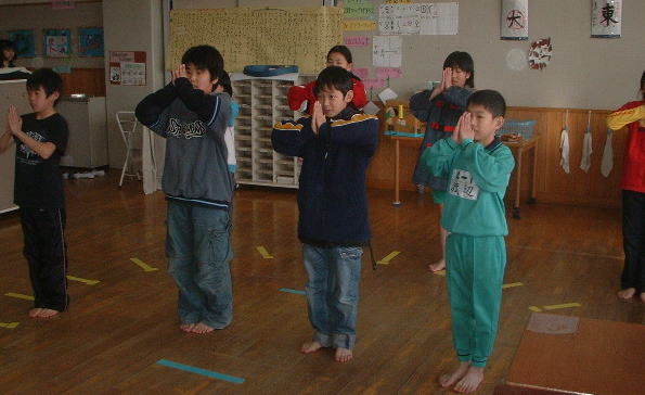 上は授業風景です。道着は着ませんが、稽古内容は道場と同じです。正面に卍を書いて正面として一礼をします。少林寺拳法は拳禅一如ですから当然技術だけでなく、講話もします。身近な事件や出来事を題材にして小学生にわかりやすいように話をします。
